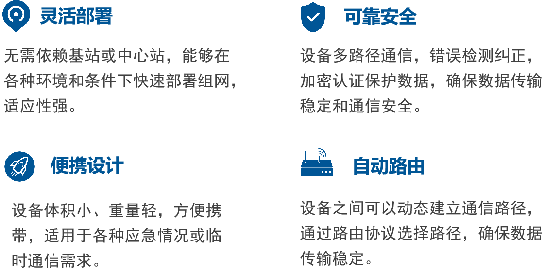 无线自组网设备,摆脱基础设施束缚,随时随地建立可靠通信,开机即用无需配置自动组局域网,实现跨点远距离无线通信。 适用于海上作业、风场通信、应急救援、工业自动化等多种场景。